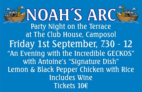 Enjoy an evening with The Geckos at The Club House on Camposol Club de Golf in aid of Noah’s ARC. Included in the ticket price is Antoine’s signature dish of lemon and black pepper chicken with rice, plus wine.